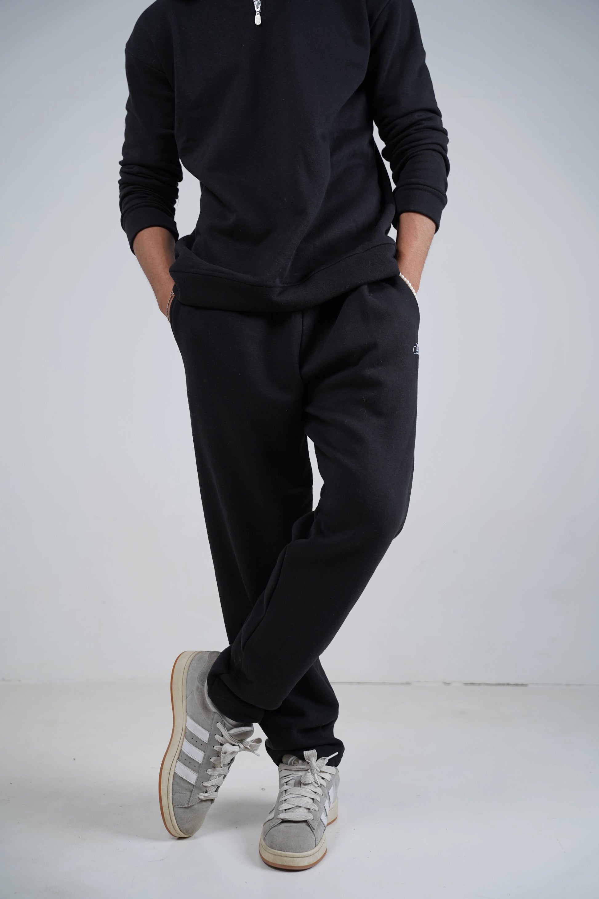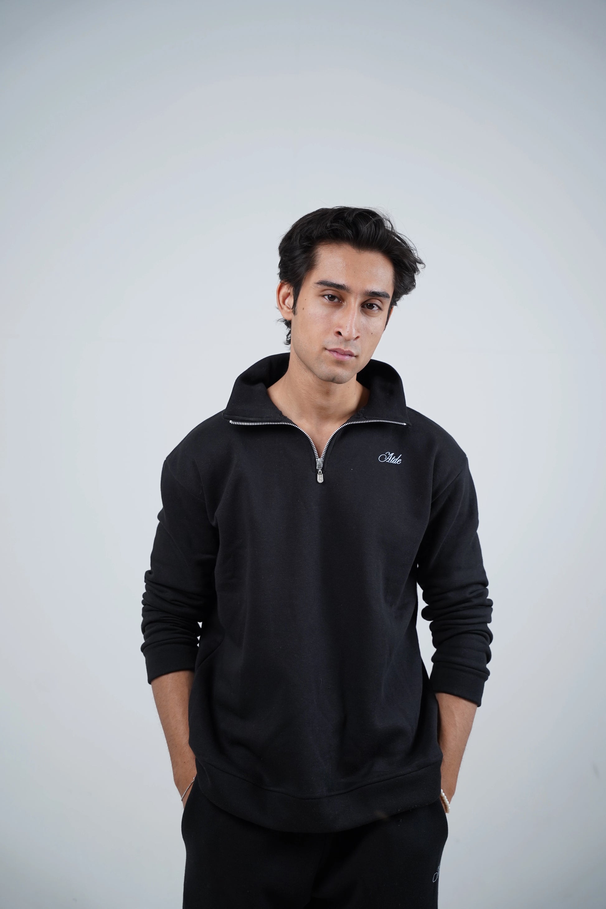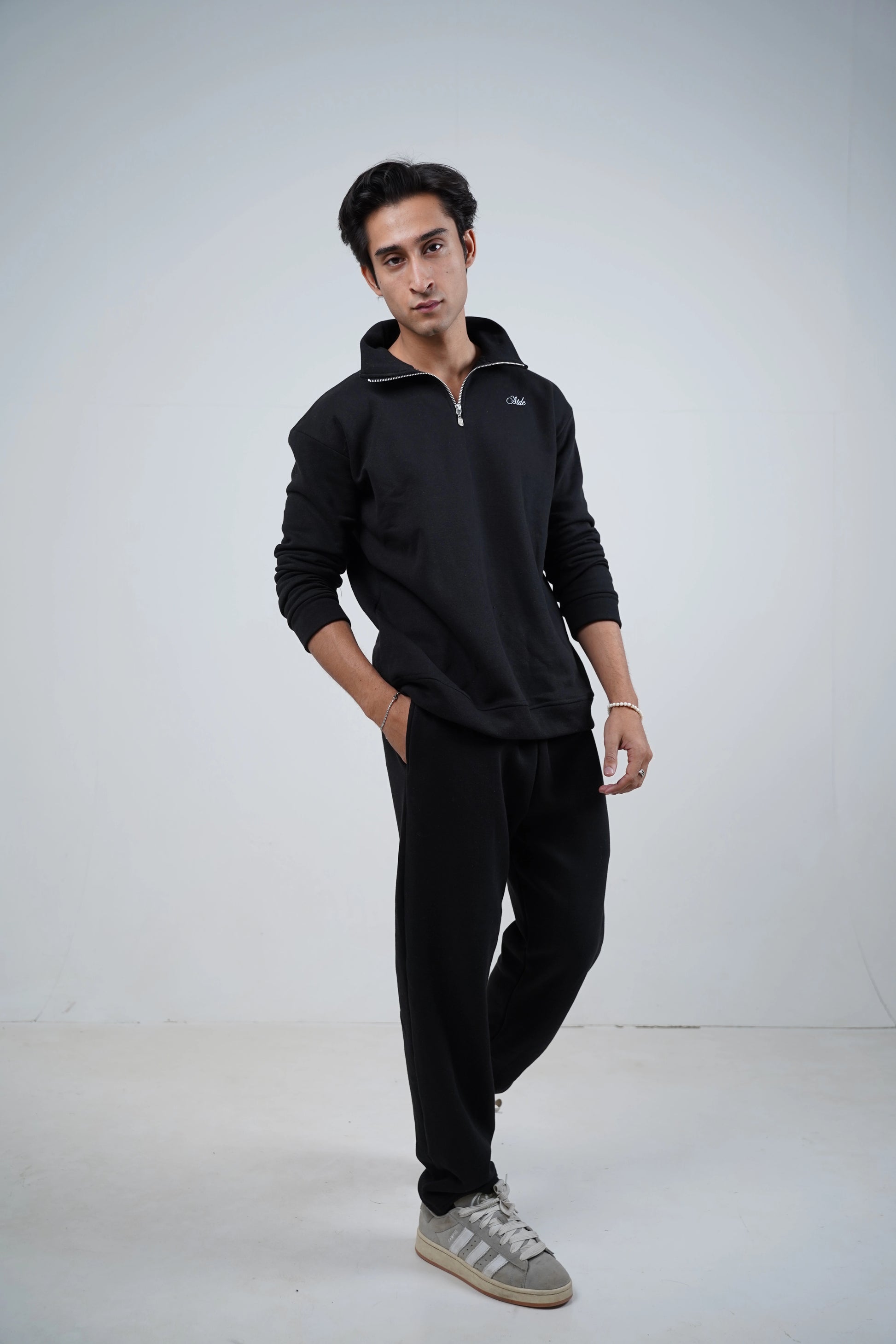A 1/4 Zipper Mock-neck paired with a Sweat-pant with an elastic waistband. Made from 280 GSM Premium Cotton Fleece making it perfect for Pakistani Winters and Daily Wear. High Density logo printing on mock-neck and sweat-pant.